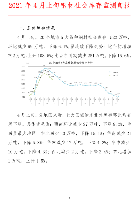 2021年4月上旬流通领域重要生产资料市场价格变动情况