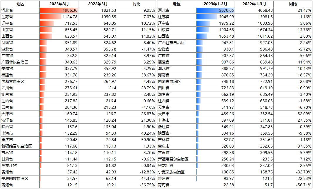 国家统计局:一季度全国分省市粗钢产量出炉 河北增21.47%、福建增41.94%……