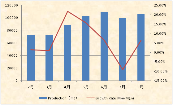 2016年1-8月,中国电解锰月产量呈上升-下降-上升趋势,总产量达到723,531吨。前六月,电解锰月产量逐月递增。7月份,因全国环保督查、原料紧张等因素,电解锰产量有所下降。然而,8月中旬以来,电解锰市场出现好转,价格不断上涨,加上一些企业检修完成,开工及增产企业增多,产... |