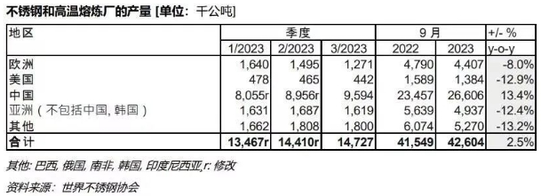 【世界不锈钢协会】2023年前九个月全球不锈钢粗钢产量同比增2.5%至4260万吨