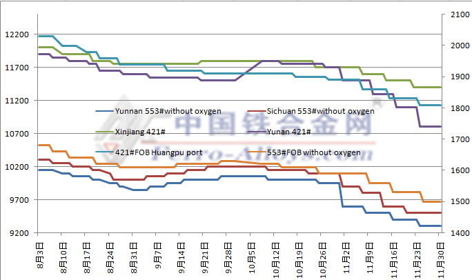 中国铁合金网讯:本月金属硅价格处于下跌走势,价格大幅度下跌,生产企业亏损经营。四川地区金属硅生产电价11月25日之后上调至枯水期水平,一些企业选择停产;云南地区12月实行枯水期电价,一些工厂准备月底停产,其中文山地区金属硅工厂已基本全线停产,出货靠库存,盈江、保山、... |