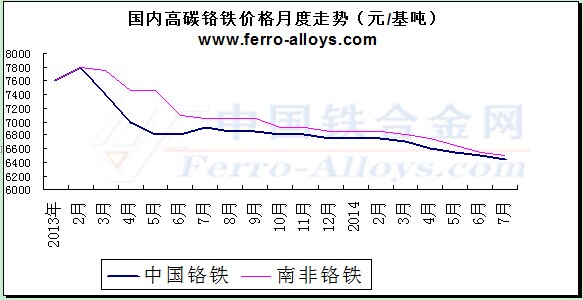 The following figure was Chinese FeCr and South African FeCr price trend in Jan.2013 to Jul.2014 in China.