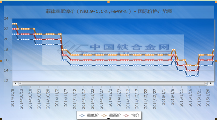 [Ferro-alloys.com]After half year’s decline, the low grade nickel ores future price started to rebound in end Jan., 2015. The main reason was the limited supply of the Philippines mines in rainy season. According to the statistics, in mid-Jan., the FOB price of low grade nickel ores (Ni0.9-1.1%,Fe49%) dropped to USD13-14/wet mt, decreasing by 68.2% compared with that of June, 2014. in end Jan., the miners tried to pull up the price. on Jan., 30th, the above material price increased to USD16-17/wet mt. under the strict environmental laws, the operating rate of blast furnace was low, which restricted the demand for low grade nickel ores. however, as the miners offered firmly in the same time, the traders just had meager profit.