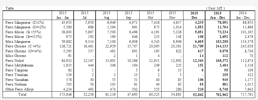 According to the import statistics of Taiwan, the import volume of major ferroalloys in the full year 2015 (January - December) was 702,962 tons, down by 2.1% from 717,761 tons in the prior year.