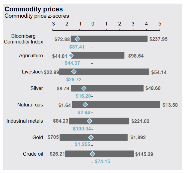 JP Morgan Asset Management in its third quarter 2018 Guide to the Markets updates updates the z-scores of commodities. A z-score is the number of standard deviations separating the current price (June 30 in the graph) from the mean price.