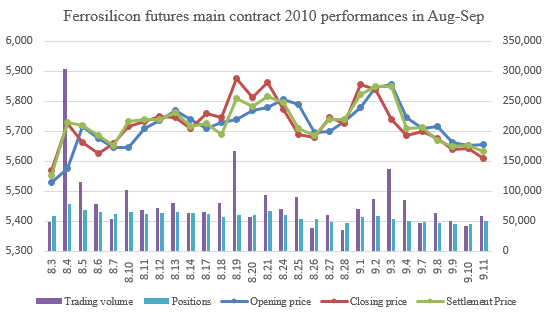 [Ferrosilicon futures 2010 contract] Opening price of ferrosilicon futures 2010 contract of this week was 5,708, highest price was 5,736, lowest price was 5,598, closing price was 5,608 and the settlement price was 5,632. The positions were 49,685 and the trading volumes were 260,917.