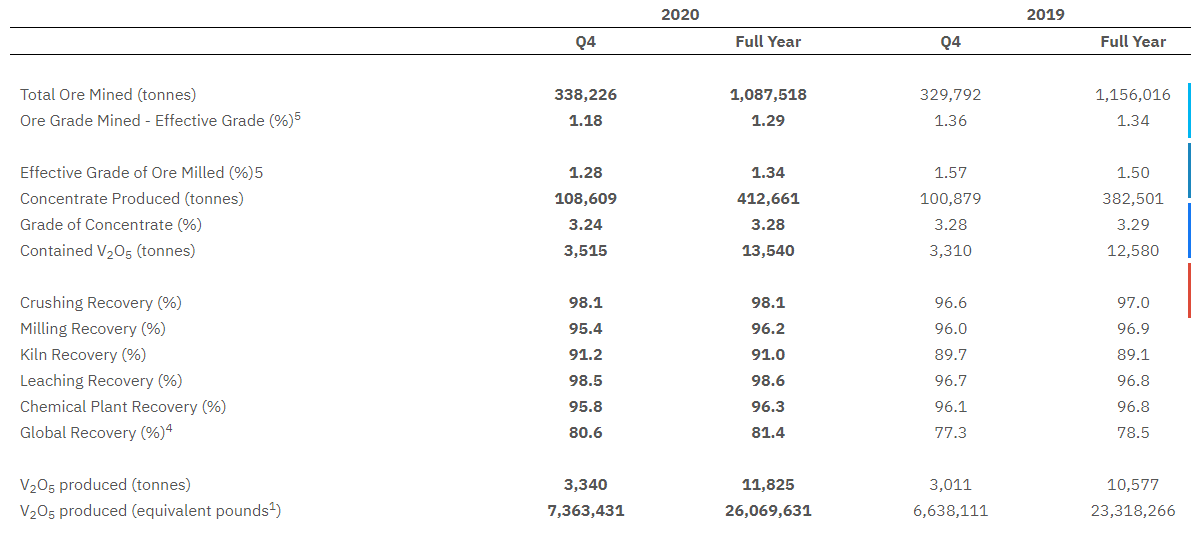 The Company mined 1,087,518 tonnes of ore with an effective V2O5 grade5 of 1.29% in 2020 compared to 1,156,016 tonnes with an effective V2O5 grade5 of 1.34% in 2019. In Q4 2020, 338,226 tonnes of ore with an effective V2O5 grade5 of 1.18% were mined compared to 329,792 tonnes with an effective V2O5 grade5 of 1.36% in Q4 2019. The Company also produced 412,661 tonnes of concentrate ore with an average V2O5 grade of 3.28% in 2020 compared to 382,501 tonnes produced in 2019 with a grade of 3.29%. In Q4 2020, 108,609 tonnes of concentrate ore was produced with an average V2O5 grade of 3.24% compared to 100,879 tonnes produced in Q4 2019 with a grade of 3.28%. The decrease in total ore mined in 2020 when compared to 2019 is largely due to operational adjustments to limit the mine site contractor workforce during the COVID-19 pandemic as well as the usage of weathered ore stockpiles in first half of 2020. The operational performance in 2020 remained in-line with the Company's plans despite the COVID-19 restrictions put in place.