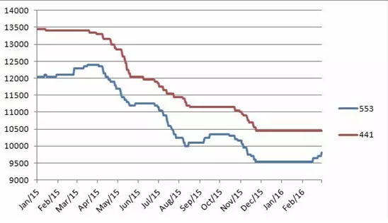 [Ferro-Alloys.com] 2015-2016,Feb.the price chart of silicon metal 553-441, and the price 553# increased in the beginning March。 |