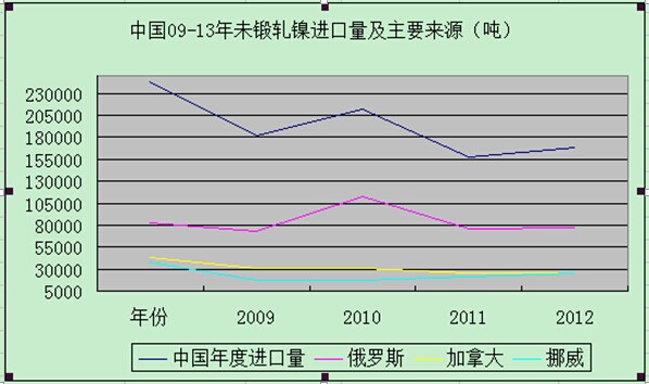 中国铁合金网讯:2009年至2013年中国未锻轧镍年度进口量呈波动下行态势,主要进口来源为俄罗斯,加拿大,芬兰,日本等。2013年中国未锻轧镍进口量总量约16.8万吨,其中从俄罗斯进口量占总量的46%,加拿大和挪威各占15%左右,日本6%,芬兰0.6%。由图1.可以看出,俄罗斯每年为中国供应的数量占中国总需求量的一半左右,其近几年走势基本上和中国总进口量走势变化基本保持一致。另外两个主要供应国中,挪威出口至中国的数量从2010年开始呈缓慢增长态势,而加拿大则开始缓慢下行。