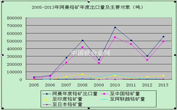 图1.2005-2013年阿曼铬矿年度出口量及至主要出口对象(吨)。