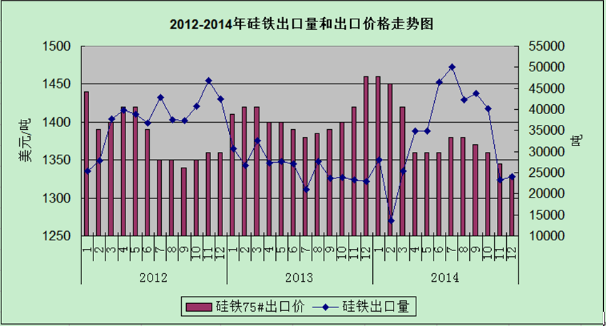 下图为2012-2014年硅铁出口量和出口价格走势图