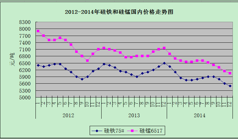 下图为2012-2014年硅铁、硅锰合金价格走势图(数据来源:中国铁合金网)