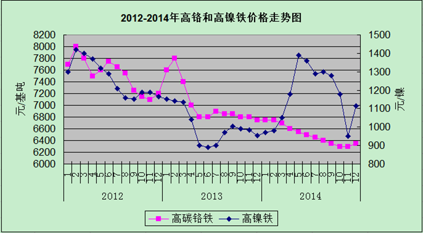 2012-2014年铬铁和镍铁价格走势图(数据来源:中国铁合金网)