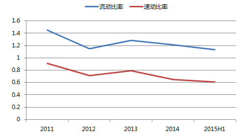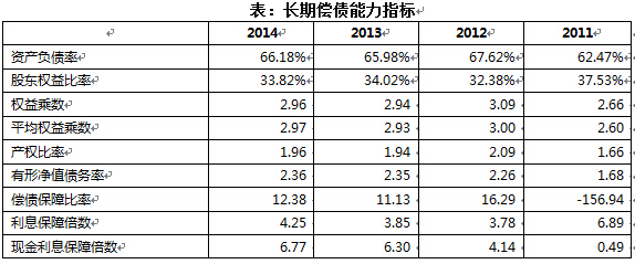 1、偿付债务能力:资产负债率一般认为小于60%是适宜的,从上图可见,嘉能可负债率一直处于60%以上,而且都呈上行趋势,逼近2012年67.62%,剔除无形资产不宜偿债的因素外,其有形净值债务率在2015年有上升的趋势,从其产权比率曲线来看,2013-2015年相对来说比较平稳,表面债权人贷款的安全性保障比较稳健。