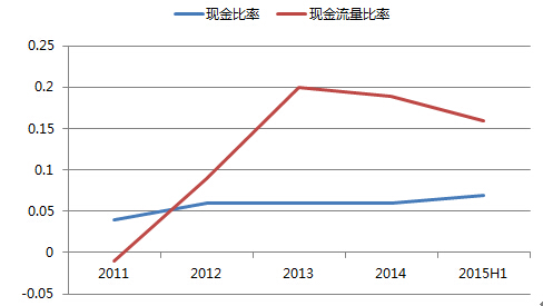 从现金角度来分析,上图现金比率平稳,表明企业未拥有过多盈利能力低的现金资产,其资产得到了有效利用;从现金流量比率曲线可见,其经营活动所得的现金流偿债的能力在下降。