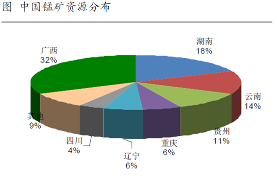中国锰矿资源较多,分布广泛,在全国21个省区均有产出。有探明储量的矿区213处,总保有储量矿石5.66亿吨,居世界第三。但中国富锰矿较少,仅占保有储量的6.4%。下图为中国锰矿资源分布图: