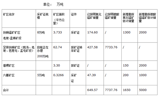 公司拥有的广西百色市德保县足荣镇扶晚锰矿老坡—孟棉矿段、陇汤矿段;田东县六林锰矿等数个矿区,已经探明锰矿储量8387.33万吨。同时随着勘探的深入,新增估值储量约3000万吨。德保县足荣镇扶晚锰矿矿区是我国正在筹划的年采选规模最大的独立锰矿矿区。其中该矿区已经探明锰矿储量8387.33万吨。