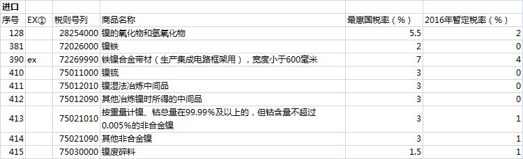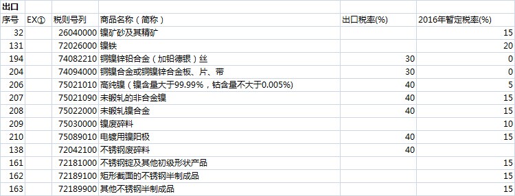 12月9日,财政部公布了《2016年关税调整方案》,对进出口税则中部分税目进行调整。调整后,2016年税则税目总数将由8285个增加到8294个。 其中涉及镍的部分未做相关调整,新的进出口关税方案自2016年1月1日起实施。