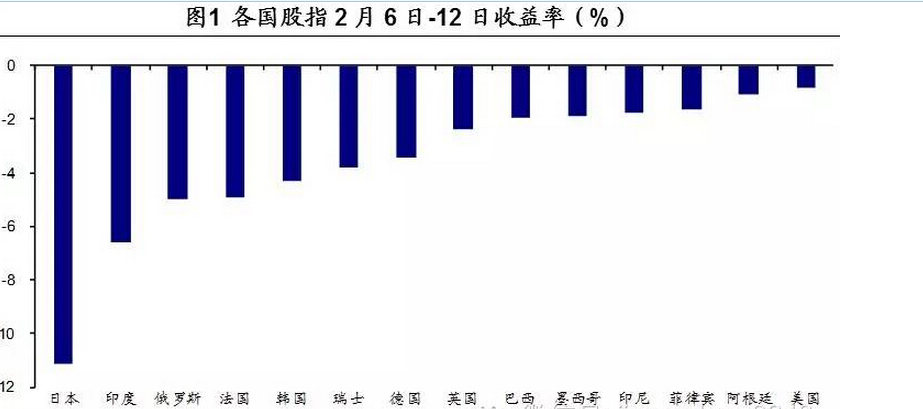 过去的一周中国因春节假期而休市,中国因素“缺席”,但全球金融市场依然动荡不安,风险资产大幅下行。自2月6日以来,全球股市可谓“哀鸿遍野”。发达经济体中,日本、法国、韩国、瑞士、德国、英国股指持续下跌超过11%、4.9%、4.3%、3.8%、3.4%、2.4%,其中韩国创业板科斯达克(KOSDAQ)指数更是在2月12日触发了8%的熔断机制,香港恒生指数刷新3年低位,美国股指跌幅一度接近3%。新兴市场股市也出现大幅调整,印度、俄罗斯股指下跌幅度一度超过6%,阿根廷、巴西、墨西哥、菲律宾股指也出现大幅下跌。