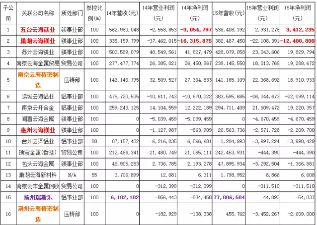 公司积极向镁铝合金下游深加工拓展,镁铝合金压铸件和挤压件等业务快速增长。公司镁合金压铸的主要产品是汽车方向盘骨架,目前南京精密饱和生产,荆州云海精密已经开始投产,利用荆州的地区优势,立足中部,辐射西南部汽车零部件市场。此外,2015年2月公司与宜安科技在安徽巢湖共同投资建设轻合金精密压铸件生产项目,投产之后合金用料将全部由云海金属提供。公司高层在调研中透露压铸件在未来五年内会呈倍数增长,挤压件方面Surface、华硕、惠普等客户需求同样看点颇多,我们预计压铸件业务的爆发将进一步提升公司总体毛利率。子公司近2年营收、净利润情况。