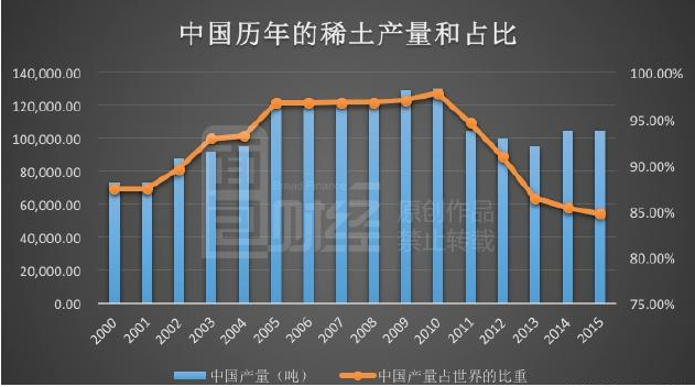 根据美国地质调查局数据计算:到2005年中国稀土产量已经占到了全球产量的96%以上,2010年时甚至占到97%以上。