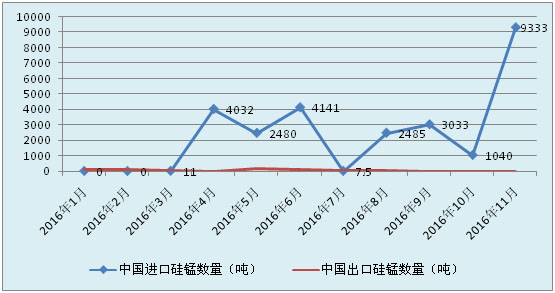 在4月和6月,中国分别进口硅锰合金4032吨和4141吨,主要是从哈萨克斯坦进口。9月中国进口硅锰3033吨。其中从乌克兰进口1526吨,从印度进口1245吨。11月中国进口硅锰9333吨,其中从印度进口7879吨,从罗马尼亚进口1044吨,从马来西亚进口405吨。