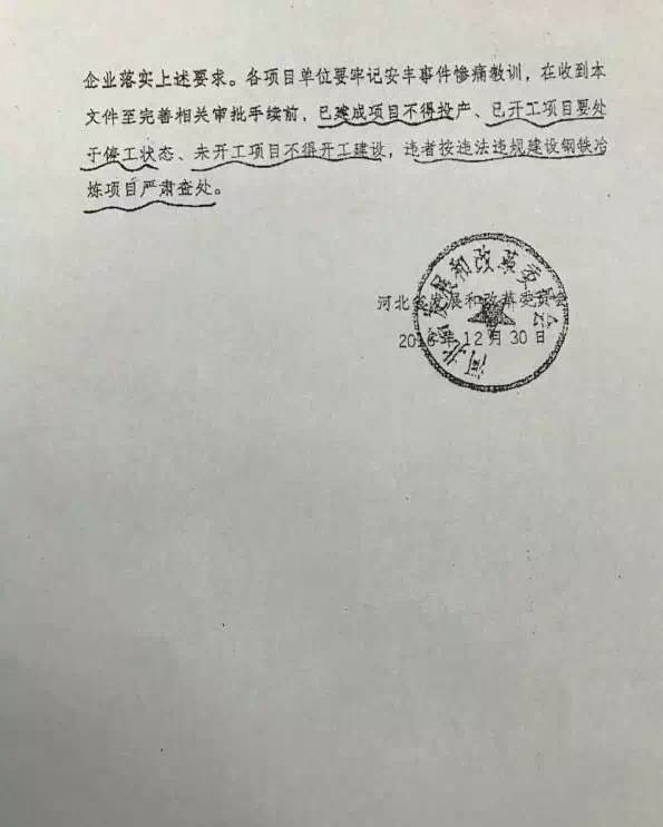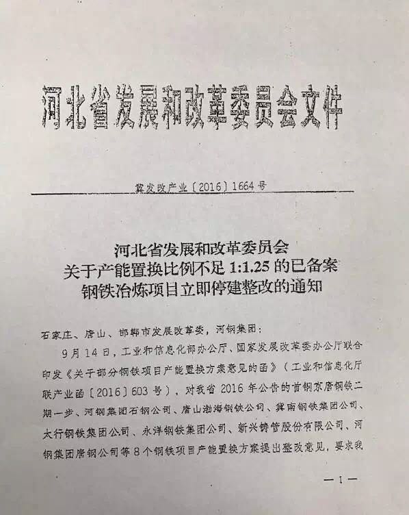 中国铁合金网讯:据西本新干线消息,近日河北省发改委下发《关于产能置换比例不足1.1.25的已备案钢铁冶炼项目立即停建整改通知》,要求相关各项目单位在收到本文件至完善相关审批手续前,已建成项目不得投产、已开工项目要处于停工状态、未开工项目不得开工建设,违者按违法违规建设钢铁冶炼项目严肃查处。
