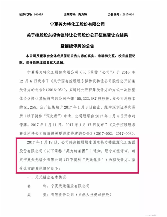 中国铁合金网讯:1月18日, 宁夏主板上市企业英力特(000635)发布公告,公司接到控股股东国电英力特能源化工集团股份有限公司通知,经专家组评审,确定宁夏天元锰业有限公司(以下简称“天元锰业”)为股权转让的拟受让方。因还需履行审核程序,公司申请继续停牌。