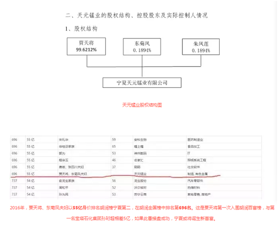 天元锰业是全球最大的电解金属锰生产企业。资料显示,天元锰业2003年成立,注册资本26.4亿元,股东为3名自然人。其中贾天将持股99.6212%,东菊凤、朱凤莲二人各持有0.1894%股份,而贾天将与东菊凤系夫妻关系。