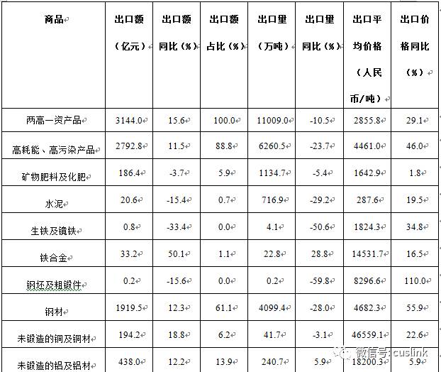 据海关信息网(www.haiguan.info)统计,今年上半年“两高一资”商品出口额为3144亿元,同比增长了15.6个百分点,出口数量为11009万吨,同比下降了10.5个百分点,出口价格同比增长了29.1%。
