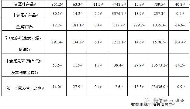 “高耗能、高污染”产品出口额为2792.8亿元,同比增长11.5%,出口数量为6260.5万吨,同比下降了23.7%,出口平均价格均有增长,整体同比增长了46%。其中,铁合金出口额同比增长高达50.1%,钢材作为主要出口产品也增长了12.3%。而“资源类”产品出口额为351.2亿元,同比增长63.3%,出口数量为4748.5万吨,同比增长15.9%,各类产品出口额和出口数量均有所增长,整体出口平均价格为739.5元/吨,同比增长40.8%。其中,金属矿砂出口增长高达181.1%,矿物燃料(焦炭、煤、原油)出口增长高达134.3%。