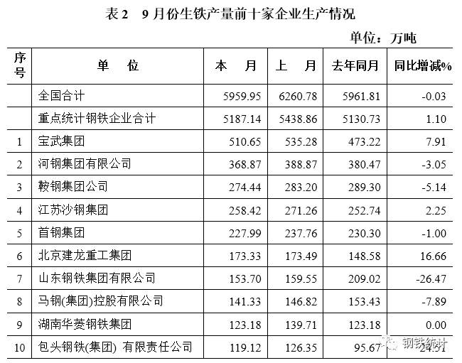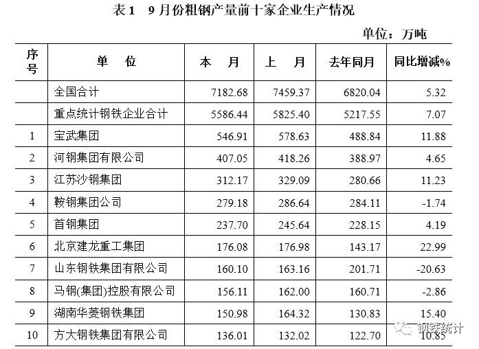 9月份,重点统计钢铁企业中,宝武集团等企业产量居前。排名居前的十家企业共生产粗钢2562.29万吨、生铁2351.03万吨、钢材2451.17万吨,分别占重点统计钢铁企业生产总量的45.87%、45.32%、45.90%,占全国钢铁生产总量的35.67%、39.45%、26.20%。
