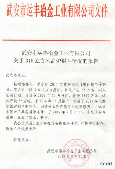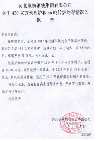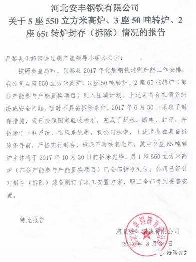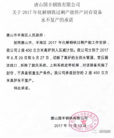河北省2017年化解钢铁过剩产能任务已经全面完成,封存装备已通过验收。按照钢铁煤炭行业化解过剩产能和脱困发展工作部际联席会议办公室印发的《钢铁行业化解过剩产能验收办法》要求,现将钢铁企业出具的封存装备永不复产承诺予以公告。