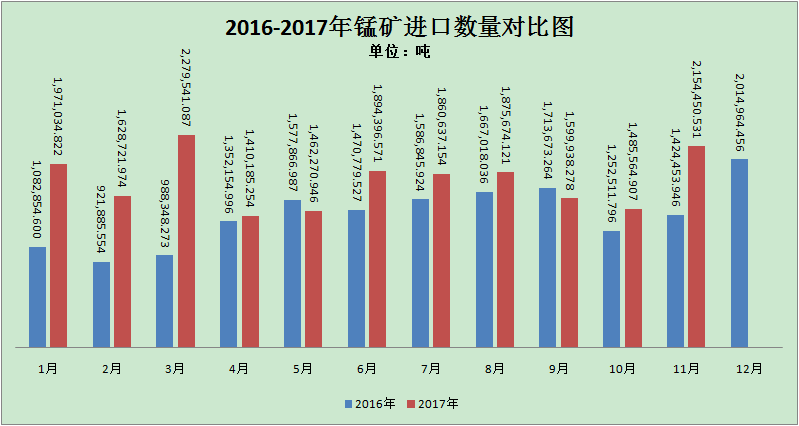 中国铁合金网讯:据海关数据统计,2017年11月份锰矿进口数量为2,154,450.531 吨,环比增长45%。2017年1-11月份中国累积进口了锰矿近期锰矿进入阶段性疲软期,1-11月锰矿进口总量为19,622,415.645 吨。