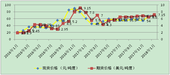 锰矿外盘方面:各大矿山对华锰矿报价均有不同幅度的上涨。South32 2018年1月对华锰矿报价平盘出台:Mn45.5%澳块7.15美元/吨度,较12月上调0.65美元/吨度;Mn48%澳籽报6.88美元/吨度,较12月上调0.53美元/吨度;而南非半碳酸锰矿报价6.5美元/吨度。康密劳(Eramet Comilog)2018年1月锰矿装船价格出台,Mn44.5%加蓬块报6.7美元/吨度,Mn43%加蓬籽报6.5美元/吨度,均较2017年12月上调0.5美元/吨度。