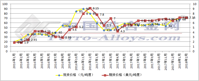 2016-2018年2月锰矿澳块期货现货价格走势图