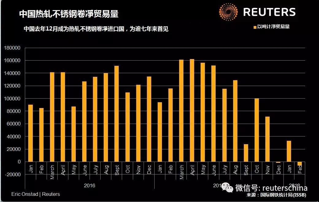 国际钢铁统计局(ISSB)及顾问公司CRU的数据显示,中国在去年12月成为热轧不锈钢卷净进口国,为逾七年来首见。这意味着中国出现重大的结构性改变。中国生产和消费的不锈钢占全球总量的一半左右。