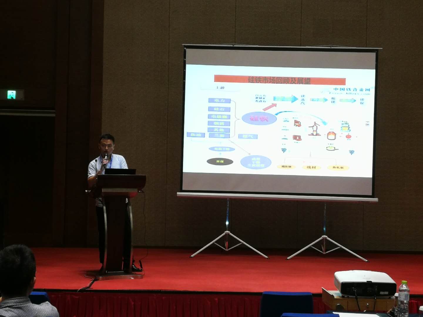 接着上台演讲的是永安金融期货时间长分析师周雨先生。在演讲中,结合各类数据,周雨先生对铁合金各类商品的市场行情进行了细致的分析,并对与会客户讲解如何期现结合。