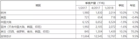中国大陆652.4万吨,同比增长约6.5%而环比下降约1.9%;