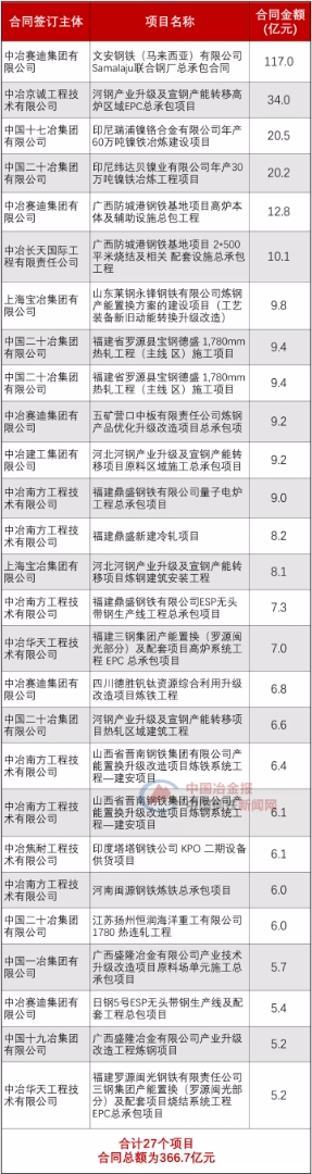 【中国铁合金网讯】近日,中国中冶发布公告称,该公司2018年新签合同额为人民币 6657.1 亿元,较上年同期增长10.4%,新签海外合同额为人民币460.6亿元。据《中国冶金报》、中国钢铁新闻网统计,其中涉及钢铁行业的项目(合同额超过5亿元)共计27个,合同额共计366.7亿元。中冶赛迪集团有限公司签订的“文安钢铁(马来西亚)有限公司Samalaju联合钢厂总承包合同”,合同金额达117.0亿元,为中国中冶2018年签订的最大的单笔钢铁项目合同。涉及的钢铁项目(合同额超过5亿元)具体情况如下表所示——