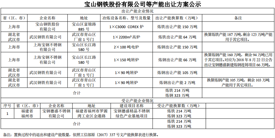 号)的要求,经国务院国资委复函( 国资厅改革 〔2019〕58 号)同意,现将中国宝武宝山钢铁股份有限公司、上海宝钢不锈有限公司和武汉钢铁有限公司出让产能情况予以公示,公示期为 2019 年 2 月 27 日-3 月 26 日 ,欢迎社会公众进行监督。