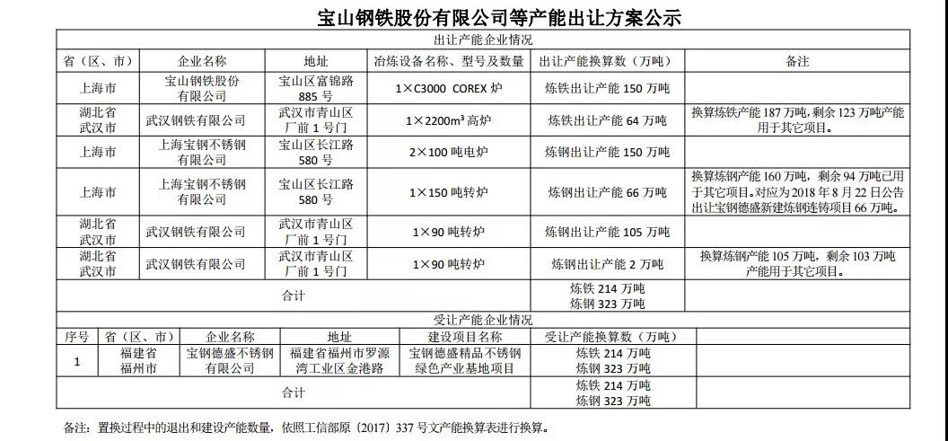 此外,2018年8月22日,中国宝武发布公告称,宝钢德盛还承接了上海梅山钢铁股份有限公司、上海宝钢不锈钢有限公司的相关炼钢产能指标66万吨,用于宝钢德盛新建炼钢连铸项目。因此,两次产能置换,宝钢德盛共承接用于新建项目所需的炼钢产能389万吨、炼铁产能214万吨。