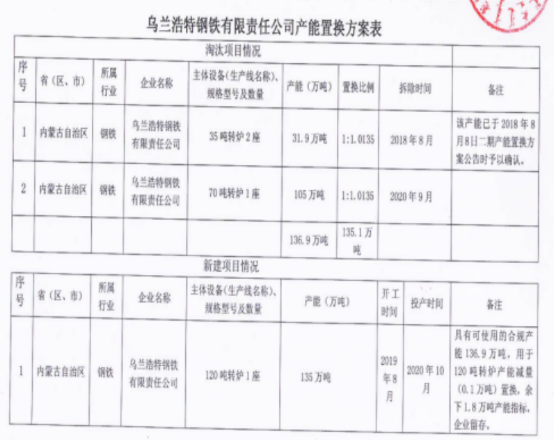 【中国铁合金网讯】按照《国务院关于化解产能严重过剩矛盾的指导意见》、《国务院关于钢铁行业化解过剩产能实现脱困发展的意见》和《钢铁行业产能置换实施办法》要求,现将乌兰浩特钢铁有限责任公司产能置换方案予以公告。