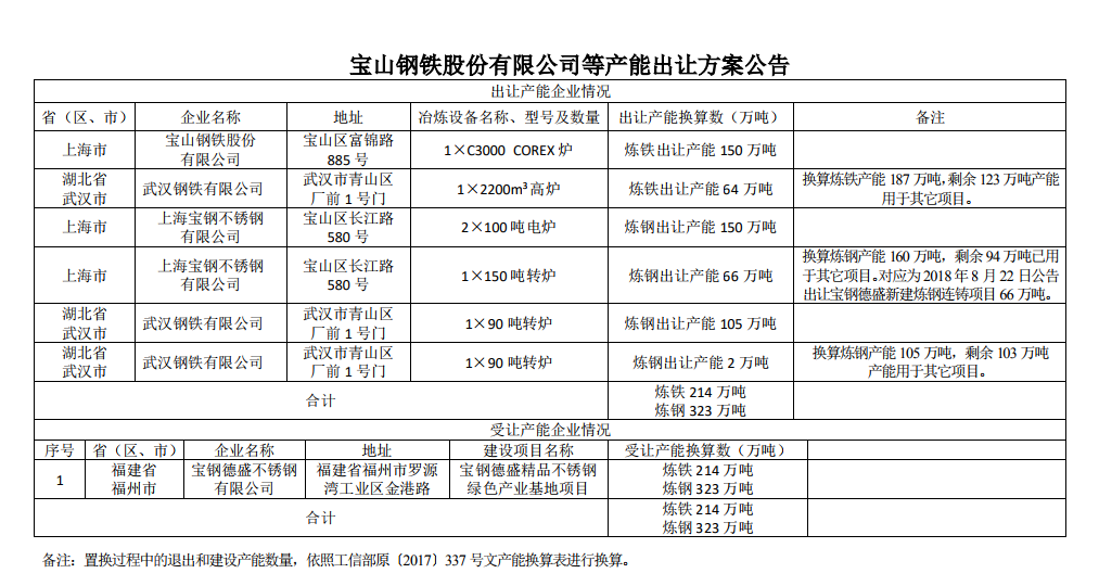 【中国铁合金网讯】按照《国务院关于化解产能严重过剩矛盾的指导意见》(国发〔2013〕41 号)、《国务院关于钢铁行业化解过剩产能实现脱困发展的意见》(国发〔2016〕6 号)和《工业和信息化部关于印发钢铁水泥玻璃行业产能置换实施办法的通知》(工信部原〔2017〕337 号)的要求,经国务院国资委复函( 国资厅改革 〔2019〕58 号)同意,现将中国宝武宝山钢铁股份有限公司、上海宝钢不锈有限公司和武汉钢铁有限公司出让产能情况予以公告 ,欢迎社会公众进行监督。