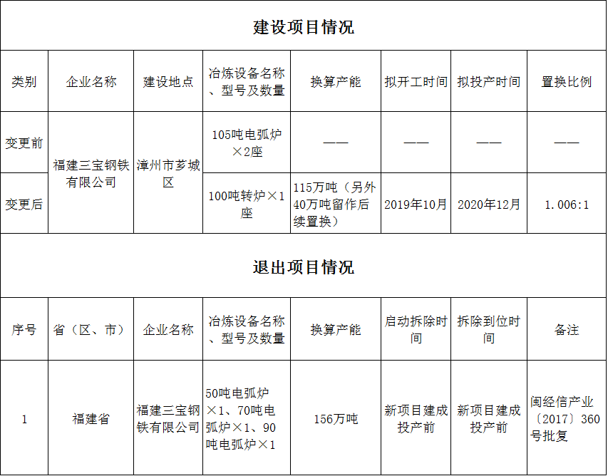 【中国铁合金网讯】按照《国务院关于化解产能严重过剩矛盾的指导意见》和《国务院关于钢铁行业化解过剩产能实现脱困发展的意见》和《工业和信息化部关于印发钢铁水泥玻璃行业产能置换实施办法的通知》要求,现将福建三宝钢铁有限公司变更炼钢项目产能置换方案情况予以公示。公示期为20个工作日,如有异议,请于公示期内向我厅反馈。