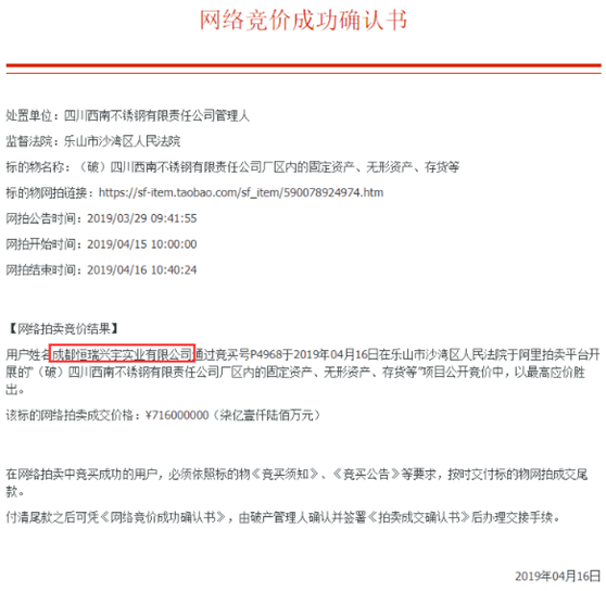 【中国铁合金网讯】4月15日,西南不锈破产资产第八次拍卖正式进行,此次拍卖吸引了3人报名参加,15日竞买号为“J9502”的竞买者率先以起拍价5.81亿元出价。16日上午竞买号为“P4968”出手加价竞拍,此后二者进行了54轮次出价,最终竞买号为“P4968”——成都恒瑞兴宇实业有限公司以7.16亿元领先,较起拍价溢价1.35亿元拍得西南不锈破产资产。
