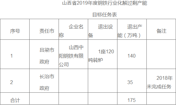 二、层层细化分解进度。2019年6月30日前,吕梁、长治两市要将目标任务分解下达到相关县和企业,并将有关信息在网站上予以公示。同时制订本市去产能工作方案,倒排拆除进度,明确市、县政府相关负责人。分解落实情况抄送省钢铁煤炭行业化解过剩产能实现脱困发展领导小组钢铁行业办公室(以下简称“省钢铁行业办公室”)。