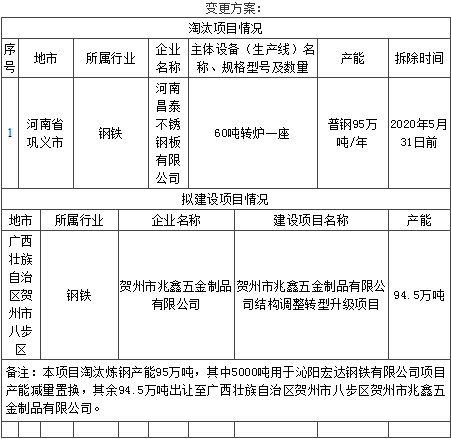 【中国铁合金网讯】按照《国务院关于化解产能严重过剩矛盾的指导意见》 《国务院关于钢铁行业化解过剩产能实现脱困发展的意见》和《钢铁行业产能置换实施办法》要求,根据河南昌泰不锈钢板有限公司申请,经我局核实并报巩义市人民政府确认,同意对河南昌泰不锈钢板有限公司原60吨转炉产能置换方案进行变更,现予以公告,欢迎社会公众进行监督。联系电话:64581056