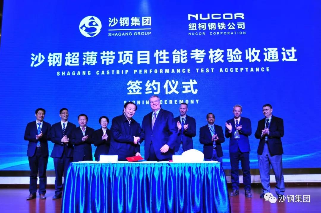 经过一年多时间的筹备,2016年8月1日,沙钢集团召开重大科技创新项目发布会,正式宣布国内首条工业化超薄带生产线建设项目启动。沙钢成为纽柯钢铁在中国唯一的战略合作伙伴,并获得了超薄带技术在中国的独家使用权及产品销售权。
