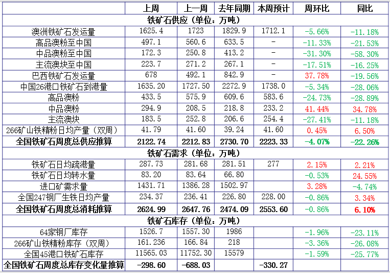 上周受到唐山限产及消息面影响,铁矿石价格先跌后涨,周环比变化较小。从发运量来看,本周铁矿石到港量1635.20万吨,绝对量较去年同期差距较大。需求端来看,目前唐山区域钢厂限产政策基本落实,区域的铁水产量影响也有所体现,不过因为尚未涉及到全国的其他区域,故铁矿石需求量短期不会出现断崖式下跌。综合而言,现阶段铁矿石依旧维持供小于求的局面,较低的库存仍是价格的重要支撑,叠加宏观面利好消息,预计本周铁矿石价格偏强走势。